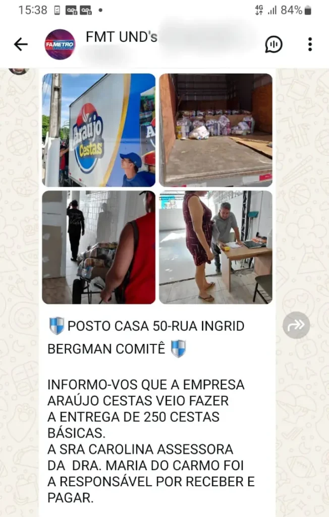 Os relatos e informações que apontam a entrega das cestas básicas foram divulgados por meio de prints de conversas do grupo “FMT UND’s 3/5”, que passaram a circular nas redes sociais.