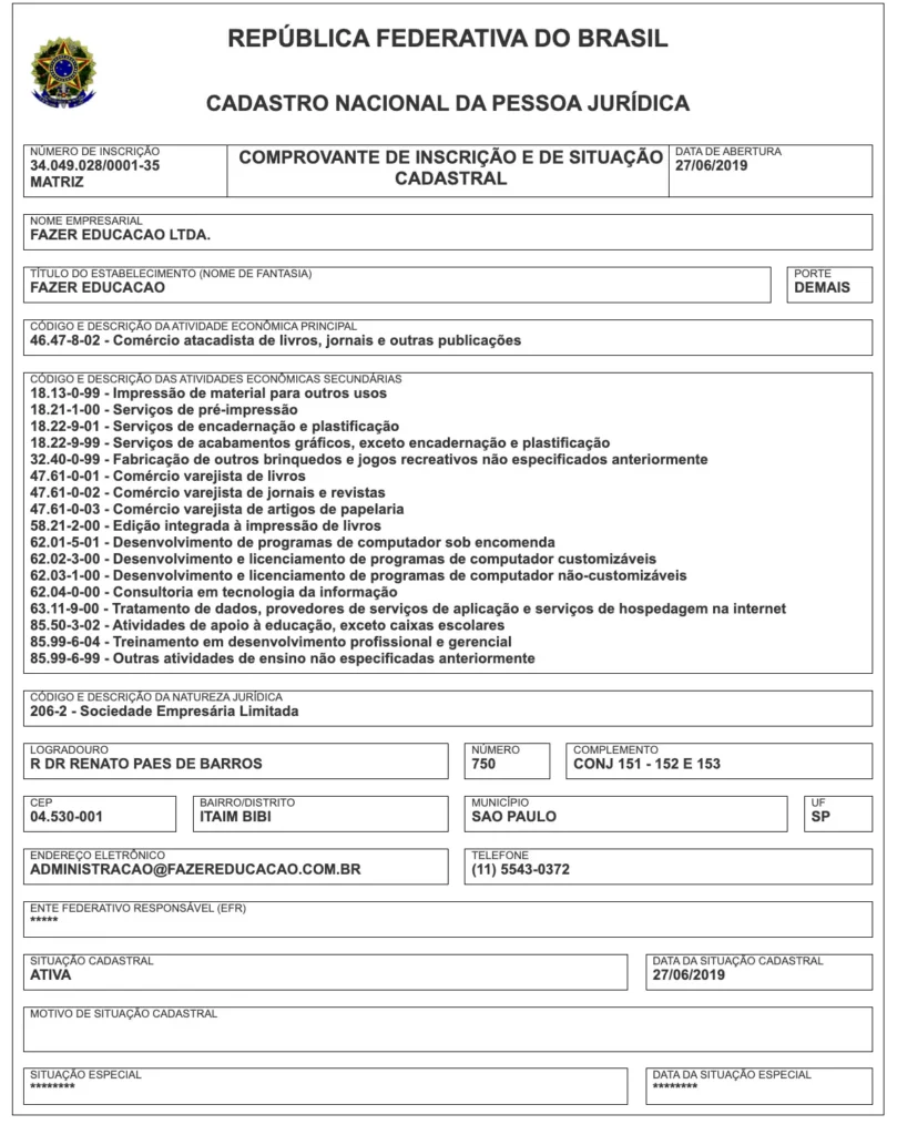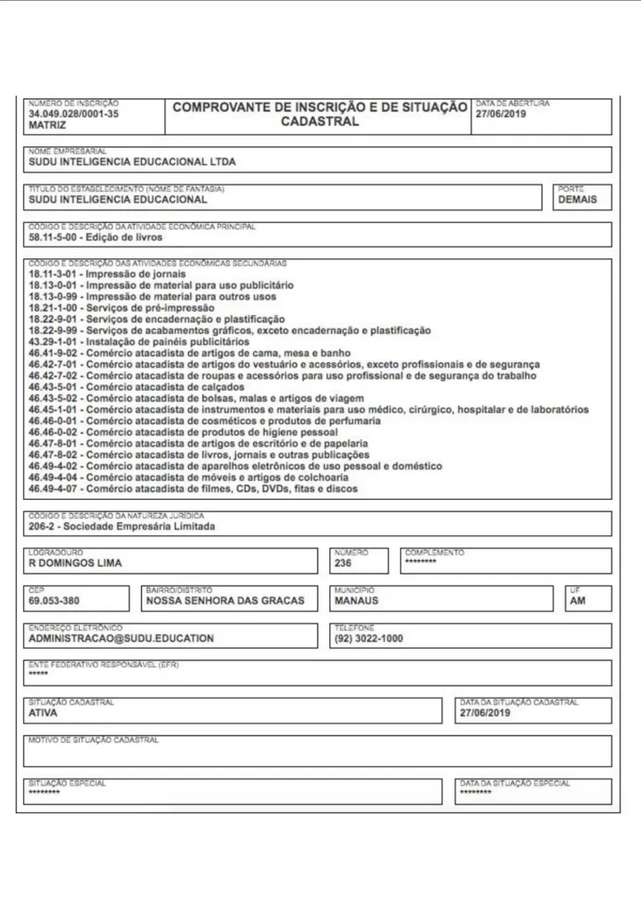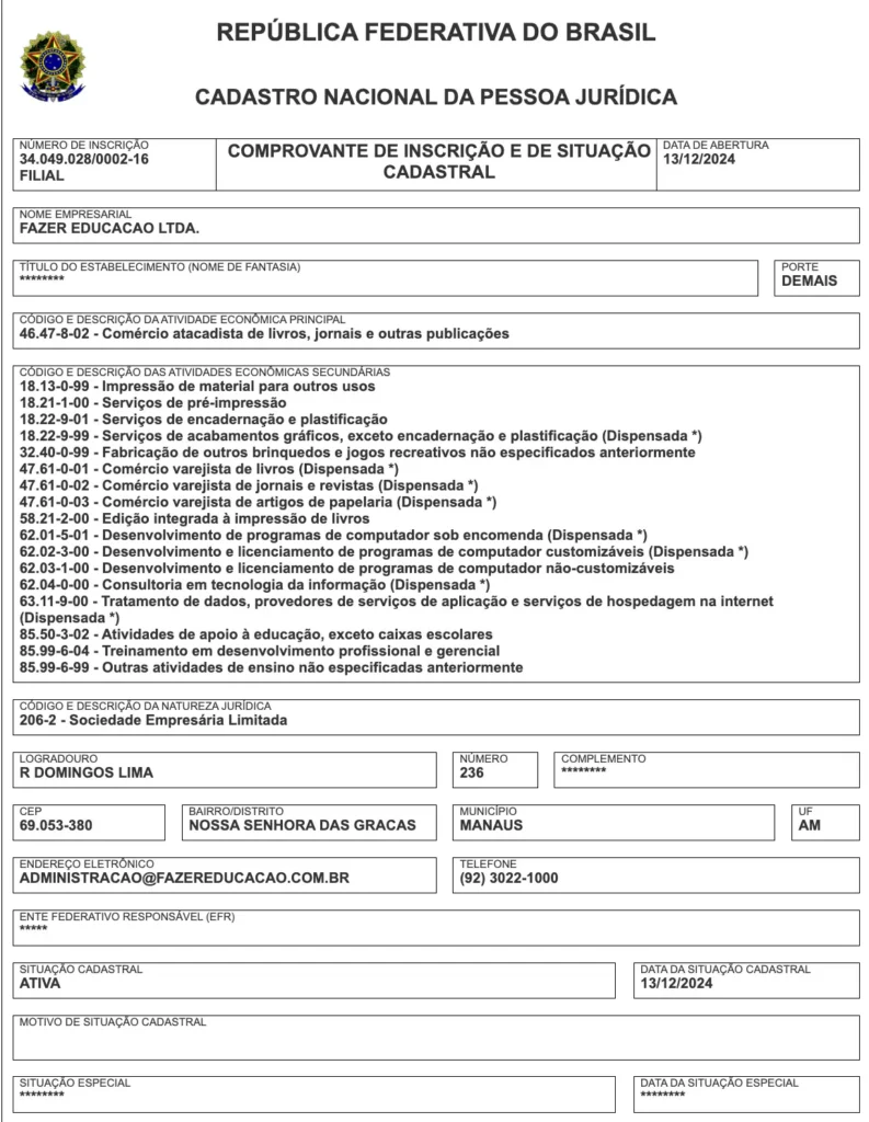 A Fazer Eduacação possui dois CNPJs registrados. O 34.049.028/0001-35, que já foi utilizado pela SUDU INTELIGENCIA EDUCACIONAL, alvo da “Operação Ghost Mask” da Polícia Federal em 1º de outubro de 2024. E também 34.049.028/0002-16. Ambas estão localizadas no mesmo endereço, na rua Domingos Lima, número 236, bairro Nossa Senhora das Graças, na zona centro-sul de Manaus.