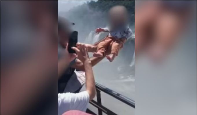 Conforme as informações, a cena foi registrada na terça-feira (17) por turistas que estavam no mirante. A imagem mostra o homem ergue o bebê no ar, a poucos metros da queda d’água, enquanto uma mulher fotografa.