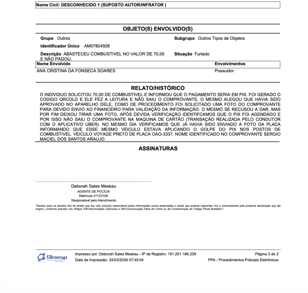 A gerente do posto lesado já registrou o Boletim de Ocorrência junto à Polícia Civil do Amazonas, anexando todas as provas, incluindo fotos do veículo e da transação.