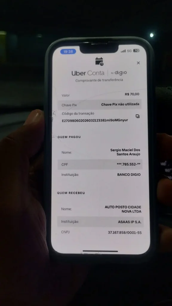 O motorista inicialmente se recusou a mostrar a tela, mas acabou cedendo. Durante a exibição, ele tentou arrastar a tela para cima para esconder o ícone de agendamento. No entanto, o registro fotográfico capturou as informações, revelando o ícone de transação agendada e a mensagem “Chave Pix não utilizada”, além de identificar o titular da conta como Sergio Maciel dos Santos Araujo. Resumindo: o indivíduo foi embora sem pagar pelo combustível.