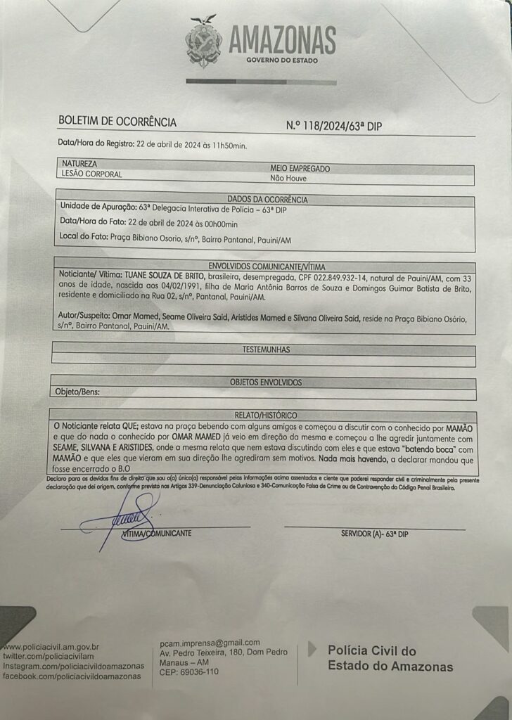 Amazonas – Na noite de domingo, dia 21, um caso de agressão foi registrado na Praça Bibiano Osorio, no bairro Pantanal, em Pauini, Amazonas. A vítima, Tuane Souza de Brito, de 33 anos, foi atacada enquanto estava na praça. Segundo relatos, o assessor de comunicação da prefeitura, Omar Mamed, iniciou o ataque, sendo posteriormente acompanhado por membros de sua família.