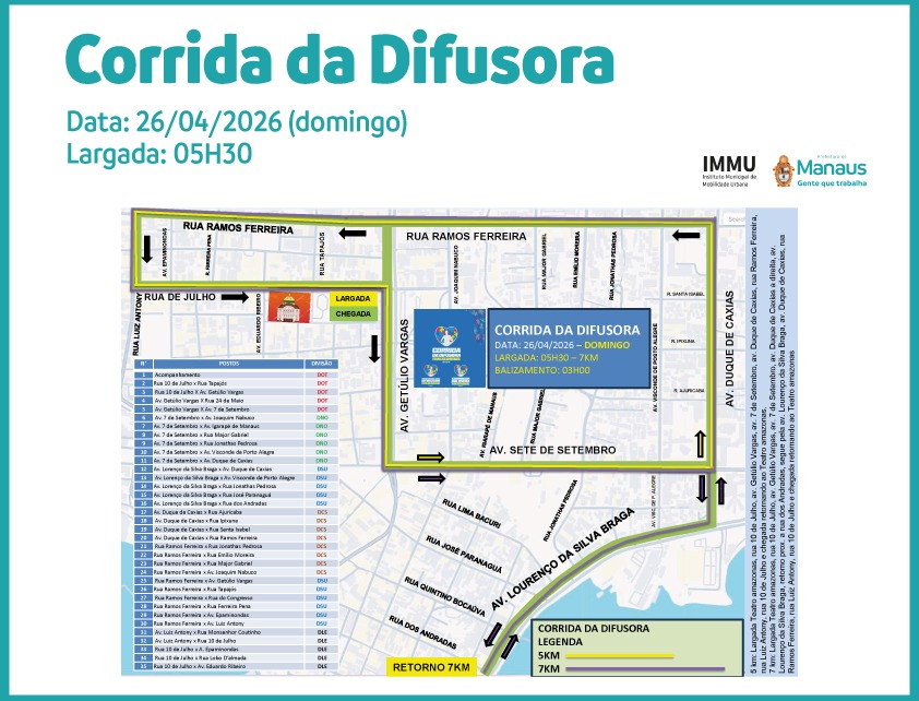 No domingo, 26/4, a atuação do instituto inicia às 3h, com a sinalização das ruas para a corrida da Difusora, no centro da cidade. A corrida começará às 5h30, em frente ao Teatro Amazonas. A prova terá trajetos de cinco e sete quilômetros, passando por importantes avenidas, como Getúlio Vargas, 7 de Setembro, Duque de Caxias e Lourenço da Silva Braga. O percurso abrange também ruas históricas do centro, como Ramos Ferreira, Luiz Antony e 10 de Julho, retornando ao Teatro Amazonas.