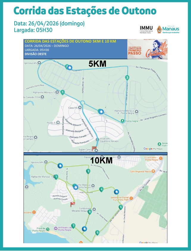 Ainda no domingo, a partir das 5h30, acontece a corrida das Estações de Outono, na área da Ponta Negra, com início e término na Super Cancun Distribuidora. As avenidas Perimetral Thales Loureiro, Liberalina Loureiro, José Augusto Loureiro e do Turismo receberão as distâncias de cinco e dez quilômetros.