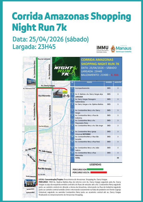 A programação inicia na noite deste sábado, 25/4, com a corrida noturna tradicional do Amazonas Shopping. A partida está agendada para as 23h45, com concentração na área interna do Amazonas Shopping, situado na avenida Darcy Vargas. O trajeto de sete quilômetros abrange trechos das avenidas Djalma Batista, Darcy Vargas e Constantino Nery, além do retorno nas imediações da Arena da Amazônia e da rua da Indústria. Ao longo de todo o percurso, agentes do IMMU estarão presentes para guiar os motoristas e garantir um fluxo adequado de veículos.
